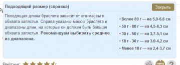 Походящая длина браслета зависит от его массы и обхвата запястья. Справа указаны массы браслета и диапазоны длин, на которые он должен быть больше обхвата запястья. - Более 80 г — на 5,0-6,6 см